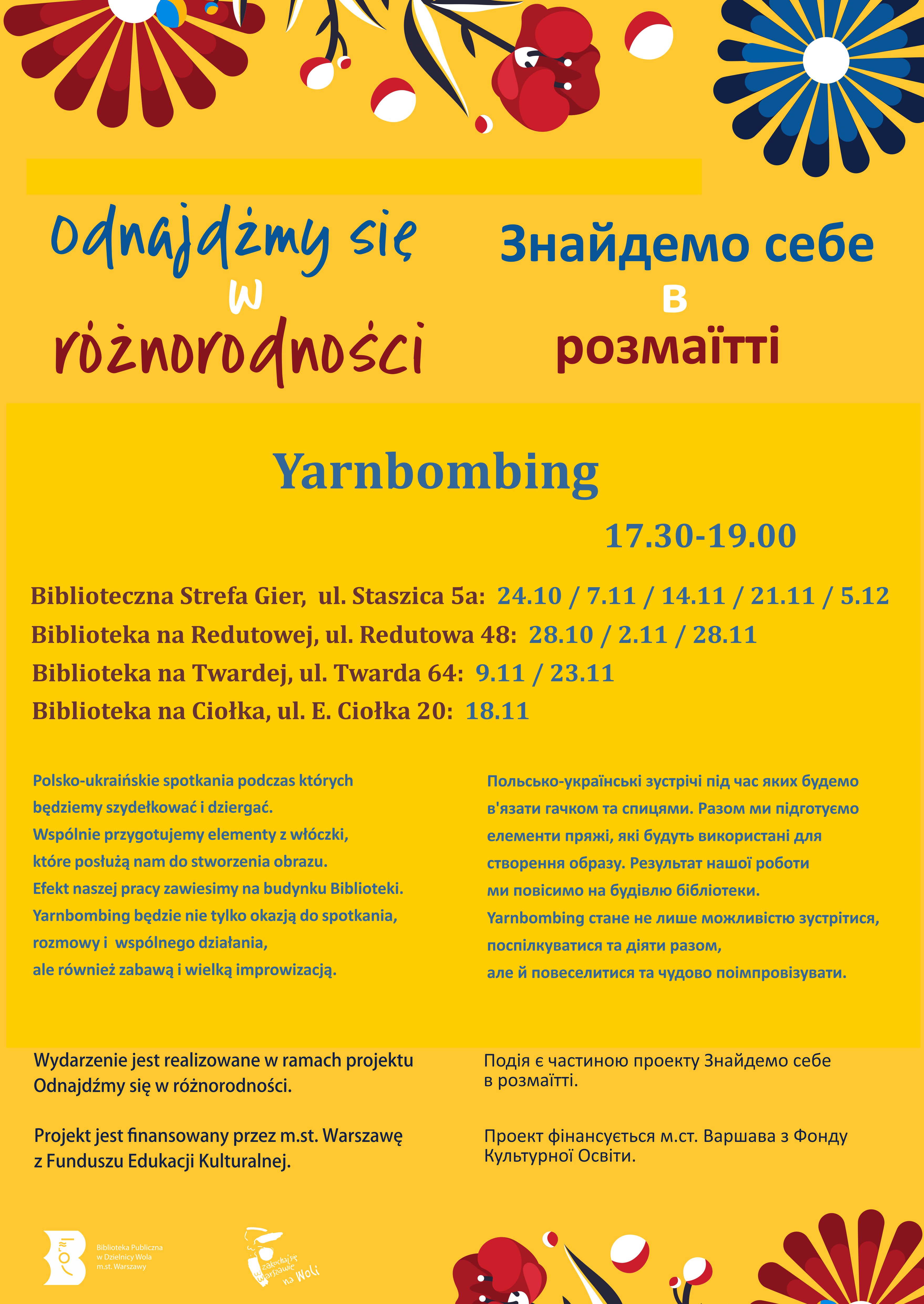 Zapraszamy na polsko-ukraińskie spotkania podczas których będziemy szydełkować i dziergać. Wspólnie przygotujemy elementy z włóczki, które posłużą nam do stworzenia obrazu – dużego wielobarwnego drzewa. Efekt naszej pracy zawiesimy na budynku Biblioteki. Yarnbombing będzie nie tylko okazją do spotkania, rozmowy i wspólnego działania, ale również zabawą i wielką improwizacją.