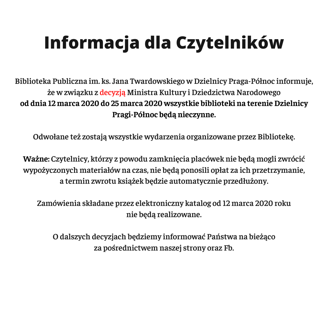 Biblioteka Publiczna im. ks. Jana Twardowskiego w Dzielnicy Praga-Północ informuje, że w związku z decyzją Ministra Kultury i Dziedzictwa Narodowego od 12-25 marca 2020 wszystkie Biblioteki na terenie Dzielnicy Pragi-Północ będą nieczynne.