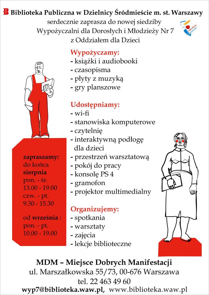 Biblioteka Publiczna w Dzielnicy Śródmieście m.st. Warszawy serdecznie zaprasza od 24 czerwca do nowej siedziby Wypożyczalni dla Dorosłych i Młodzieży nr 7 z Oddziałem dla Dzieci przy ul. Marszałkowskiej 55/73.