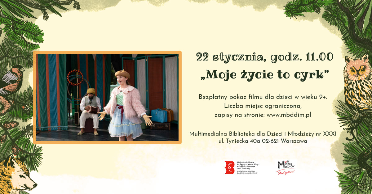 Multimedialna Biblioteka dla Dzieci i Młodzieży nr XXXI zaprasza 22 stycznia o godz. 11:00 na bezpłatny pokaz filmu „Moje życie to cyrk”. Seans dla dzieci w wieku 9+. Liczba miejsc ograniczona, rezerwacja miejsc online na stronie biblioteki: www.mbddim.pl