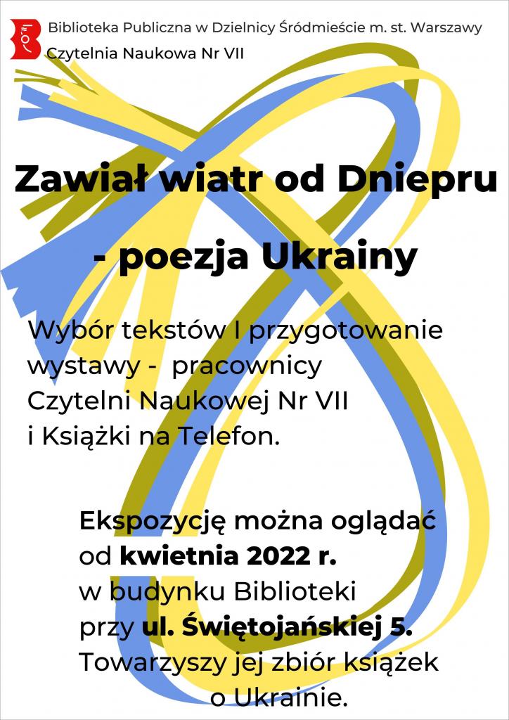 Wystawa prezentuje wiersze i wybrane fragmenty tekstów twórców ukraińskich w polskich tłumaczeniach. Wszystkie pozycje dostępne są w księgozbiorze Czytelni Naukowej nr VII, której pracownicy wraz z koleżankami z Książki na Telefon dokonali stosownego wyboru.