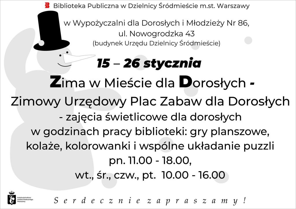 Wypożyczalnia dla Dorosłych i Młodzieży nr 86, ul. Nowogrodzka 43 (budynek Urzędu Dzielnicy Śródmieście) zaprasza na Zimę w Mieście dla Dorosłych – Zimowy Urzędowy Plac Zabaw dla Dorosłych – zajęcia świetlicowe dla dorosłych: gry planszowe, kolaże, kolorowanki i wspólne układanie puzzli.