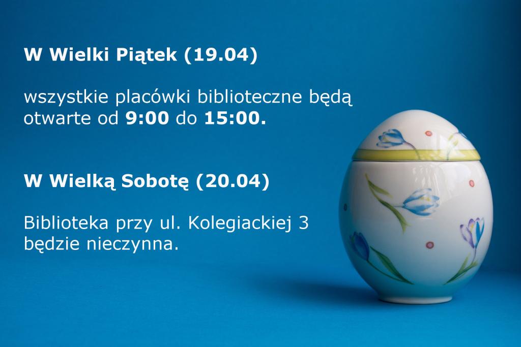 W Wielki Piątek (19 kwietnia) zapraszamy do naszych placówek bibliotecznych w godzinach od 9:00 do 15:00.
